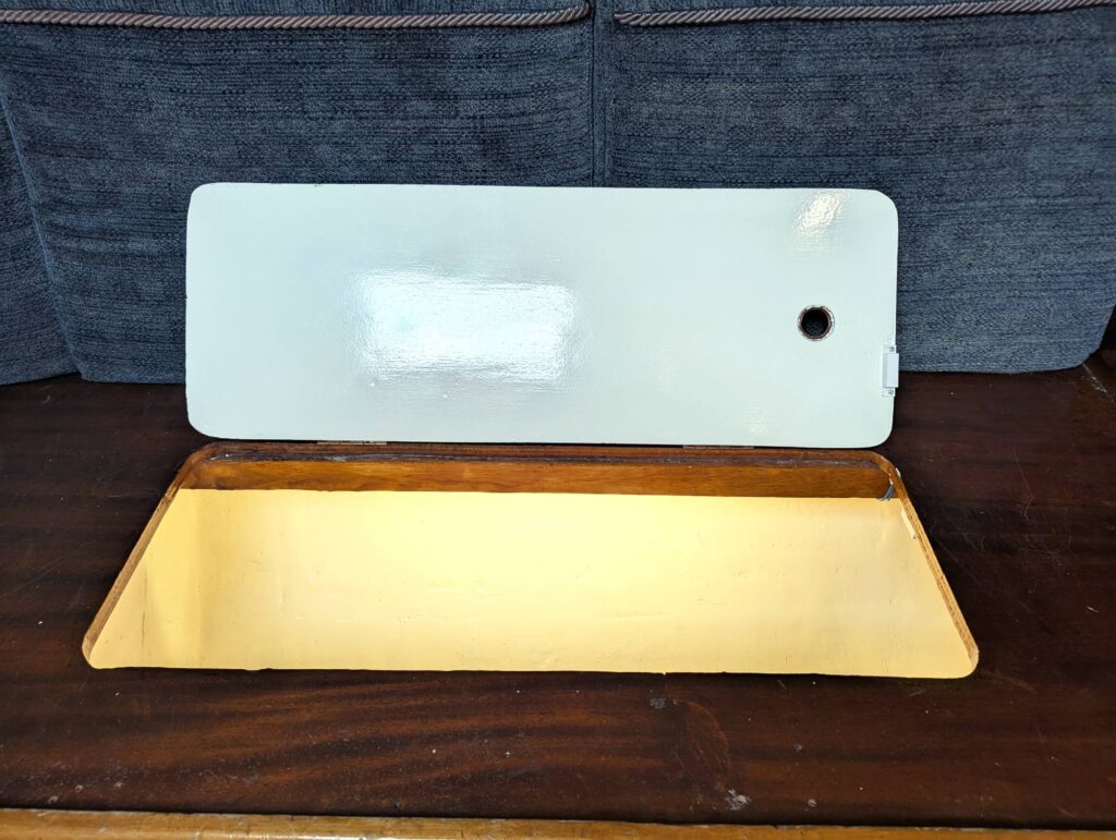 After vacuuming as much of the dust as possible, and wiping down all surfaces with a acetone, a coat of white Interlux Bilgekote was applied. Bilgekote is an enamel paint designed to protect against water, oil and other contaminates from damaging the wood or fiberglass. The paint was applied using a wool roller wherever possible to achieve a consistent finish. In some of the nooks and crannies, it was necessary to use a brush. In these locations care was taken to apply the paint as smoothly as possible.
