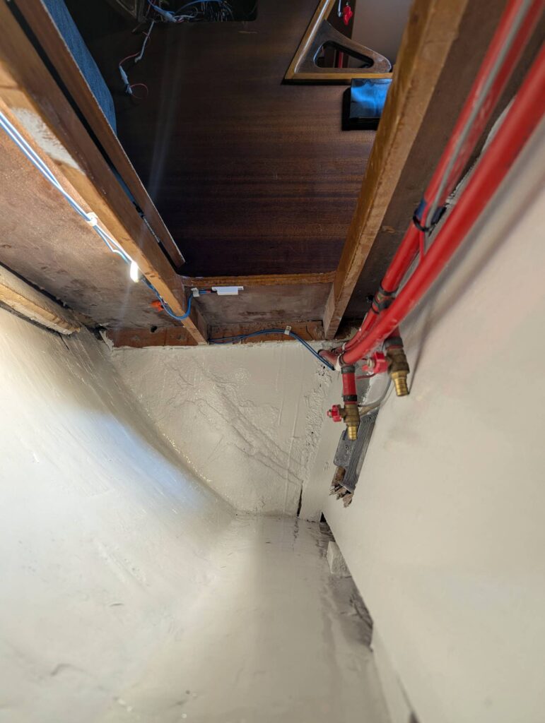 Since we aren’t living aboard Isola Naida yet, we aren’t sure how we are going to use this space yet. In the future, when we’ve figured that out, we’ll make containers or dividers that will help keep the space organized in all conditions. Smoothing the hull will help by providing a more uniform surface for those containers or dividers to be designed for.