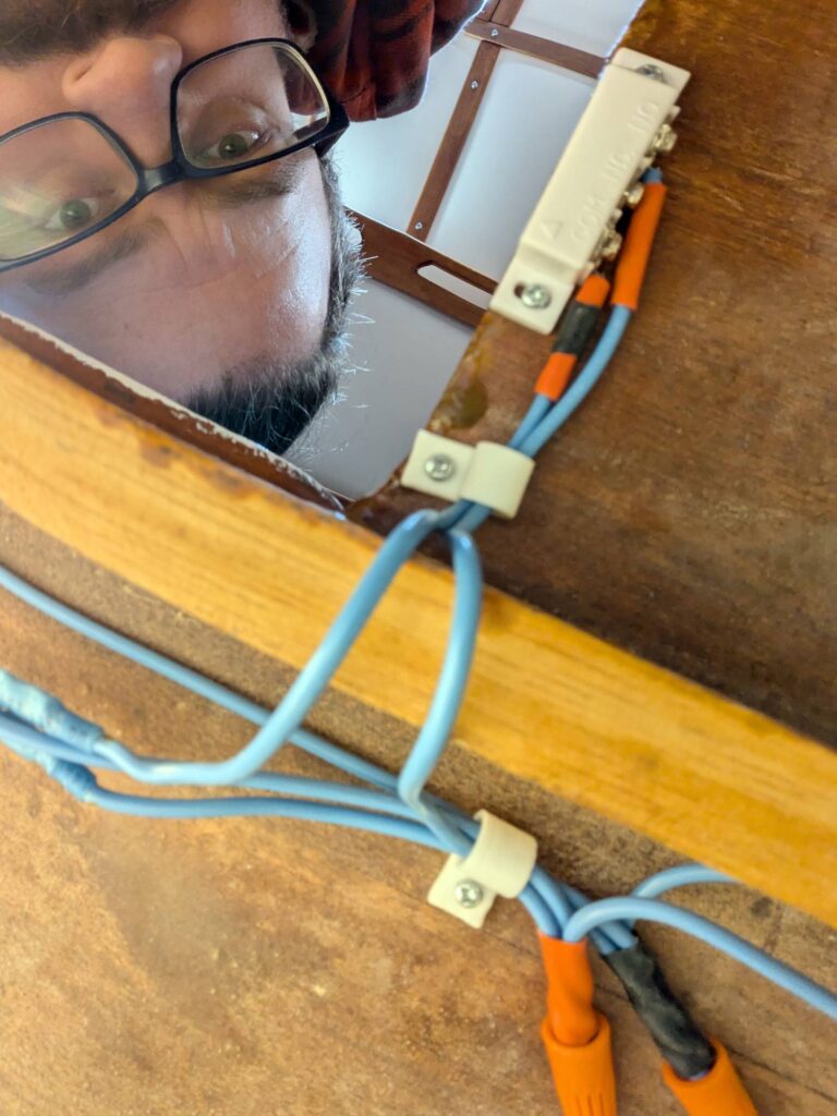 The final step was to install everything to the underside of the settee. Small screws were used to hold the switches in place. The LED strip was stuck on using the 3M Adhesive backing (which we are expecting to fail in the future, at which point we will explore other solutions). For cable management, D’Arcy 3D printed cable clips to hold the wires in place. These were screwed in as necessary to tidy everything up.